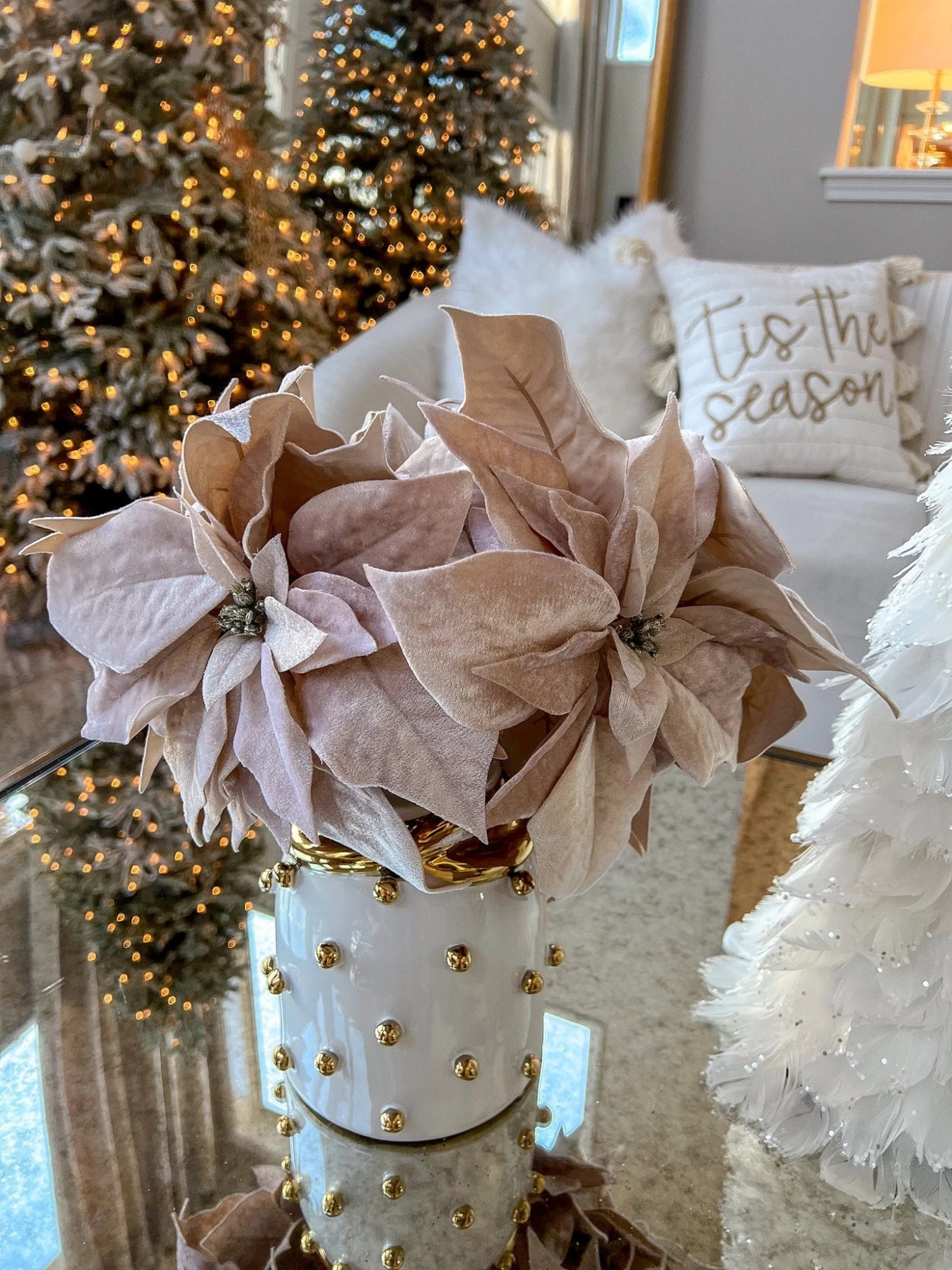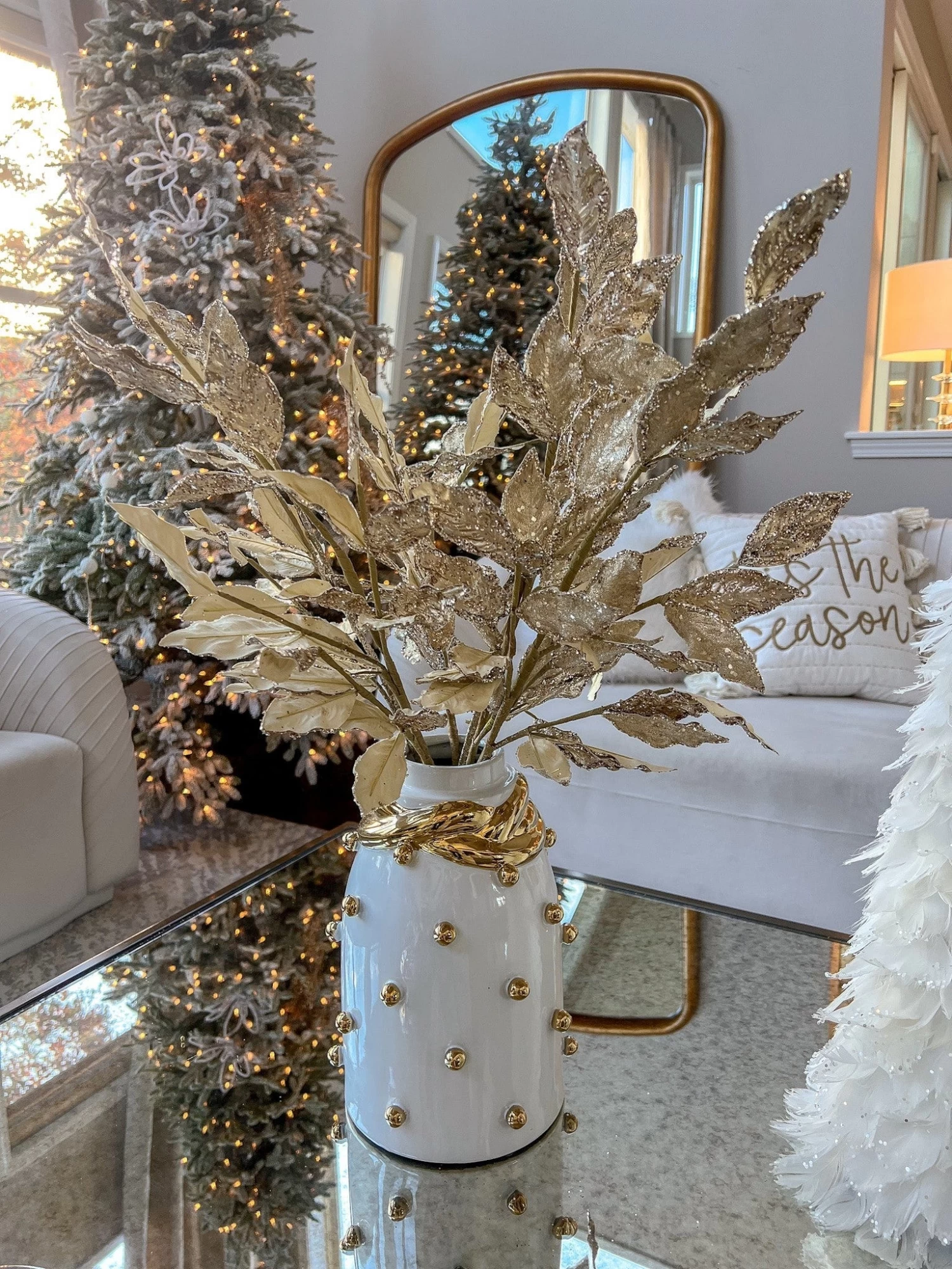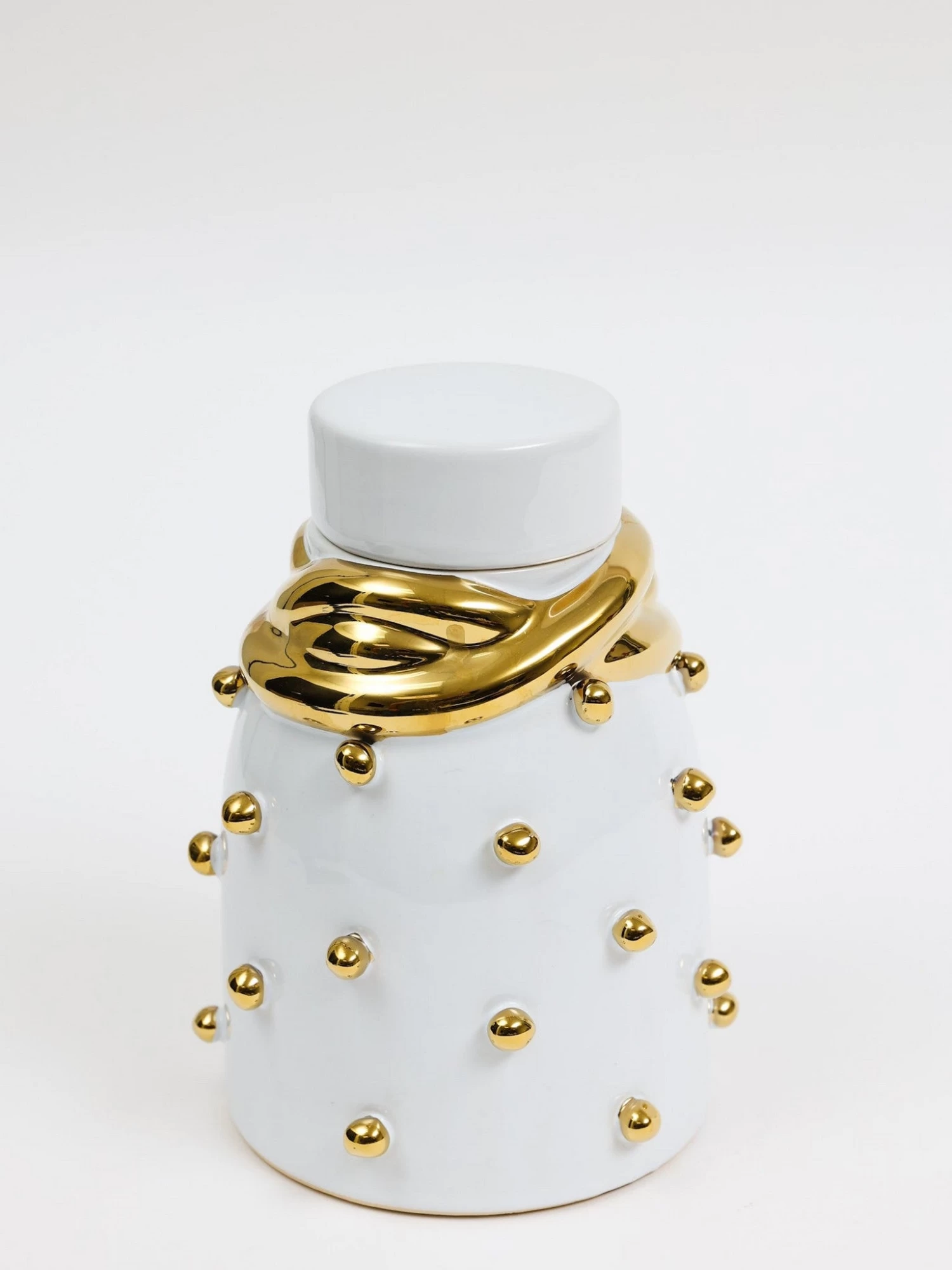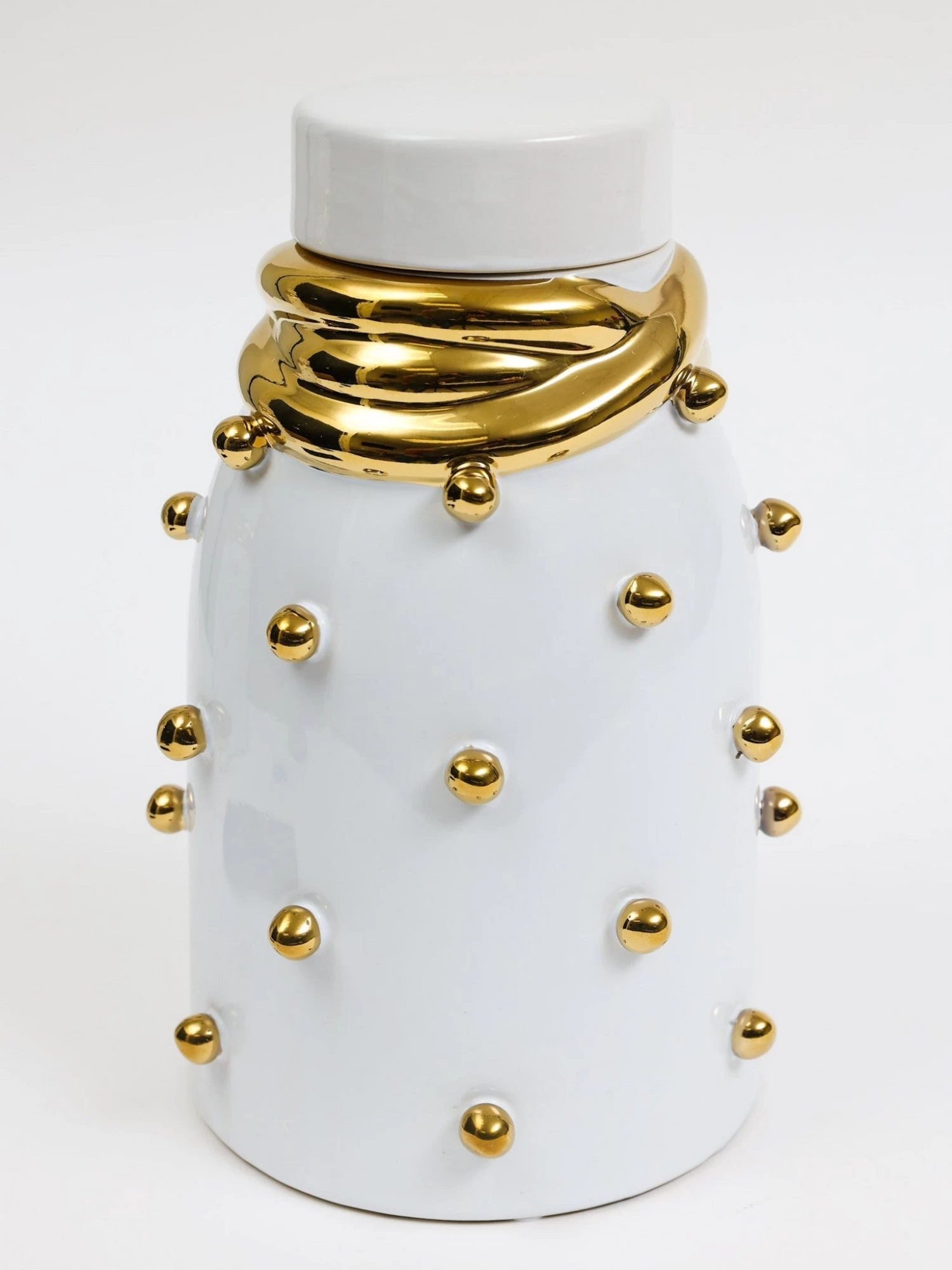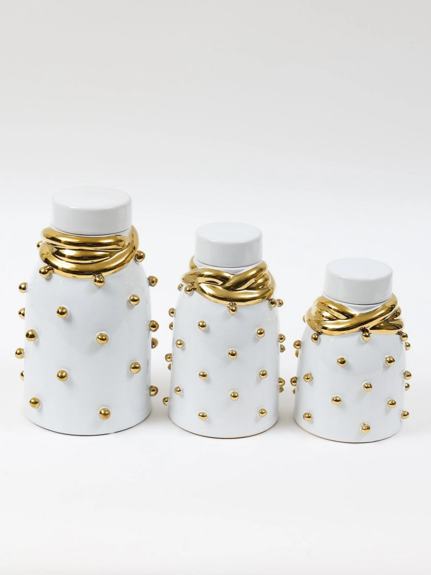 Description: The stunning glossy white ceramic jars have exquisite gold studs and will make great containers! These will add a brilliant touch of glam to your kitchen counter or living room! These can be used as a vase with your favorite faux florals or in the kitchen.