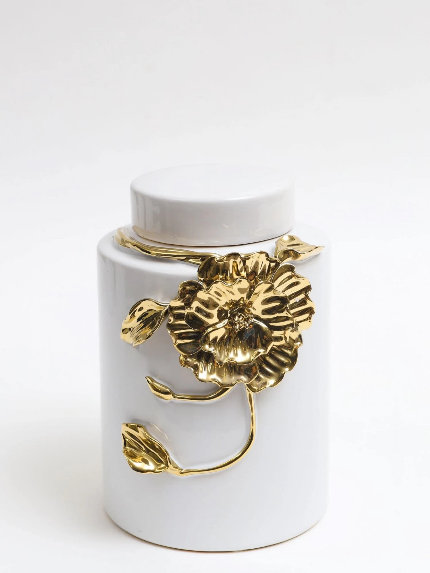 Description: These white and gold canister vases have such a beautiful and unique style! You can style it with the lid on top of a tray to create height or you can add your favorite faux florals. Either way, this is one stunning piece!