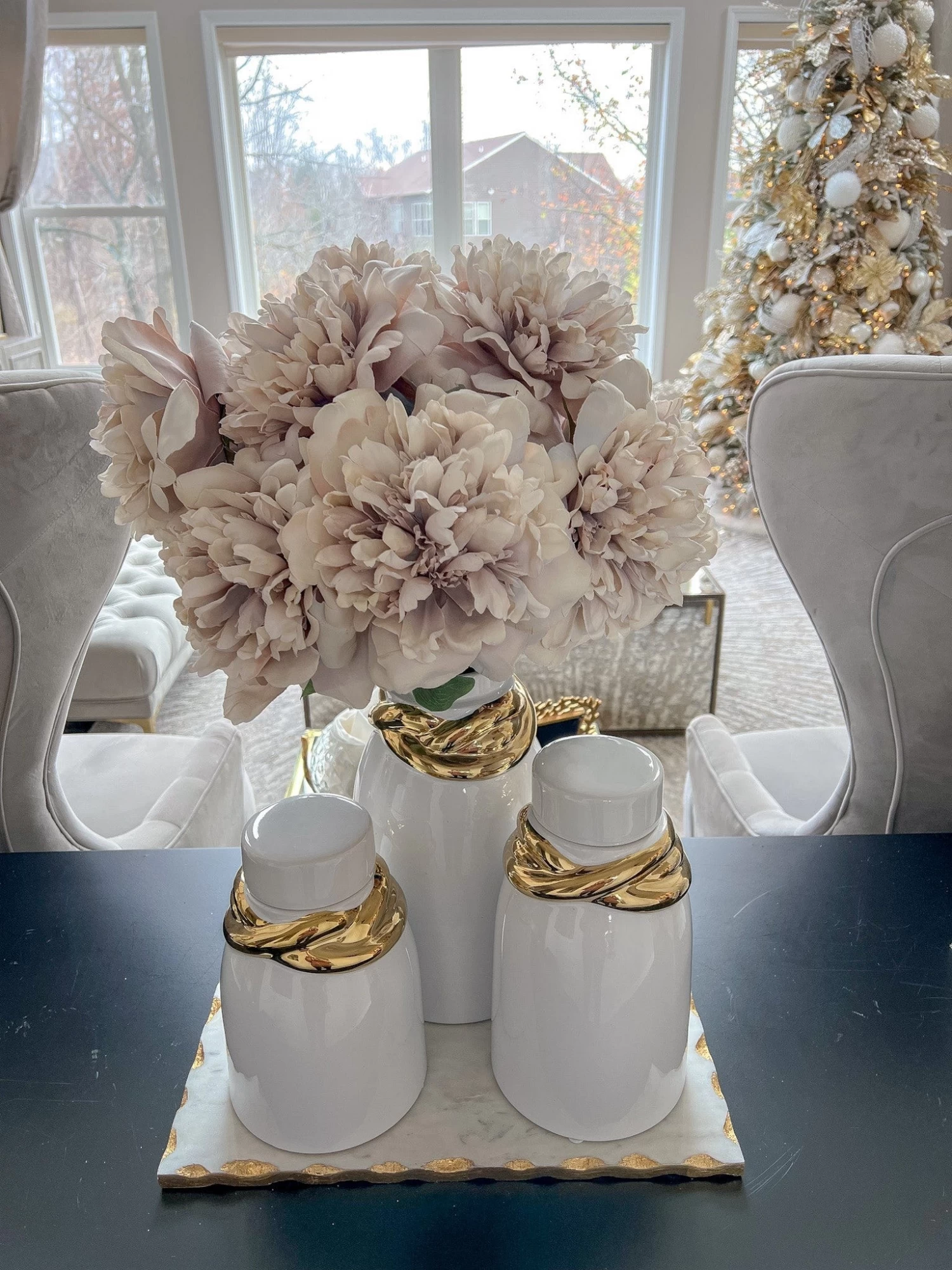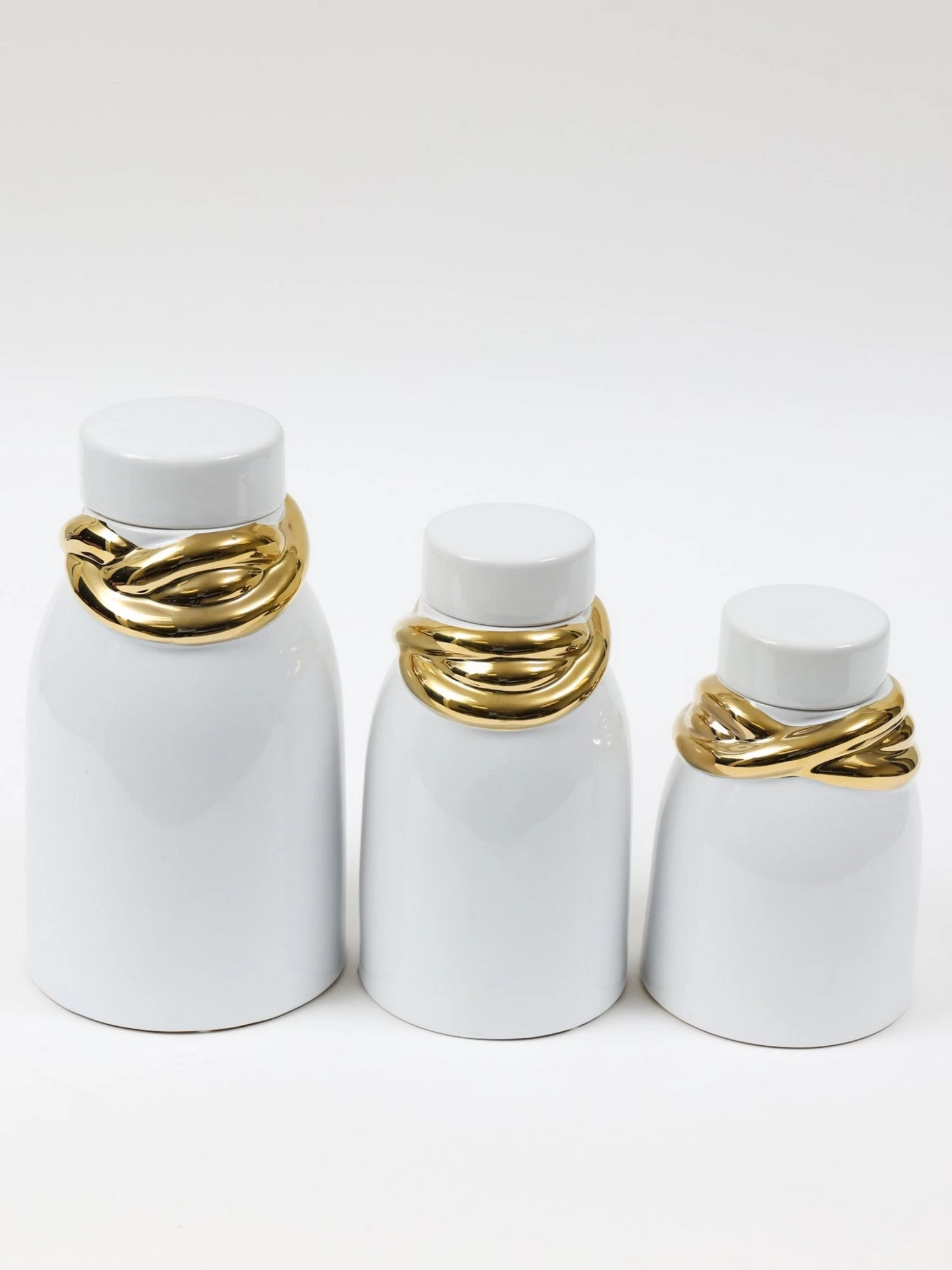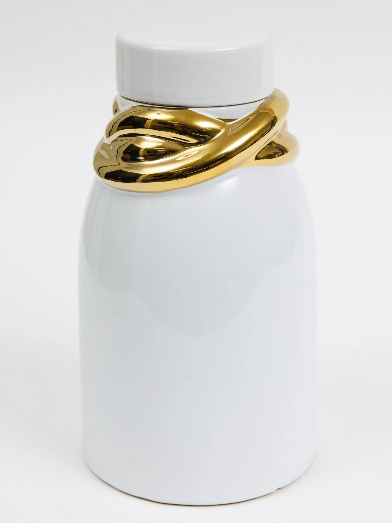 Description: Check out this substantial white jar with a white lid! The white glossy ceramic body has an elegant gold detail and is simply gorgeous!
