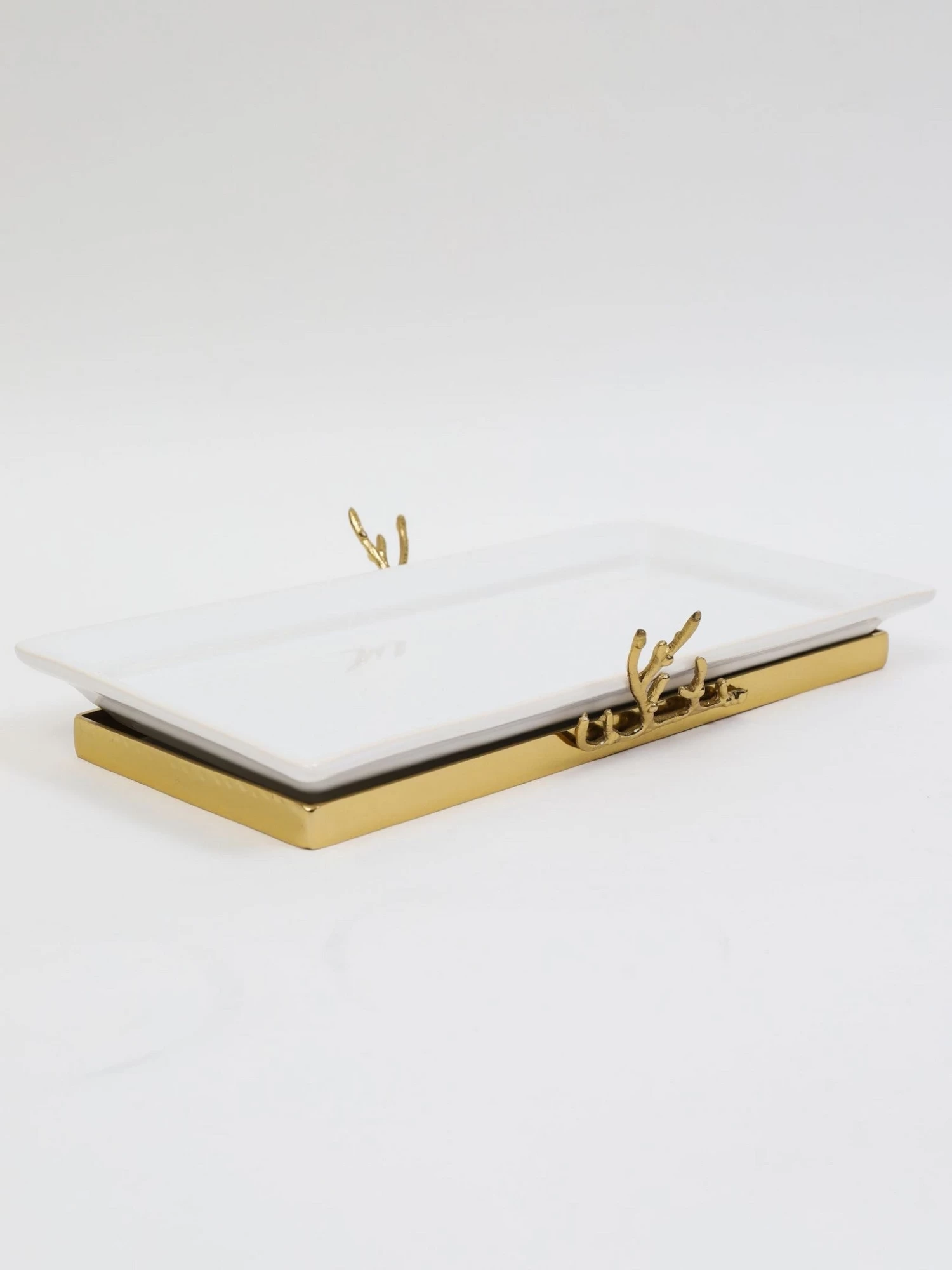 Description: This beautiful tray is a great piece of elegant design. The gold textured details compliment the glossy white ceramic to create a timeless look of sheer elegance and glam.