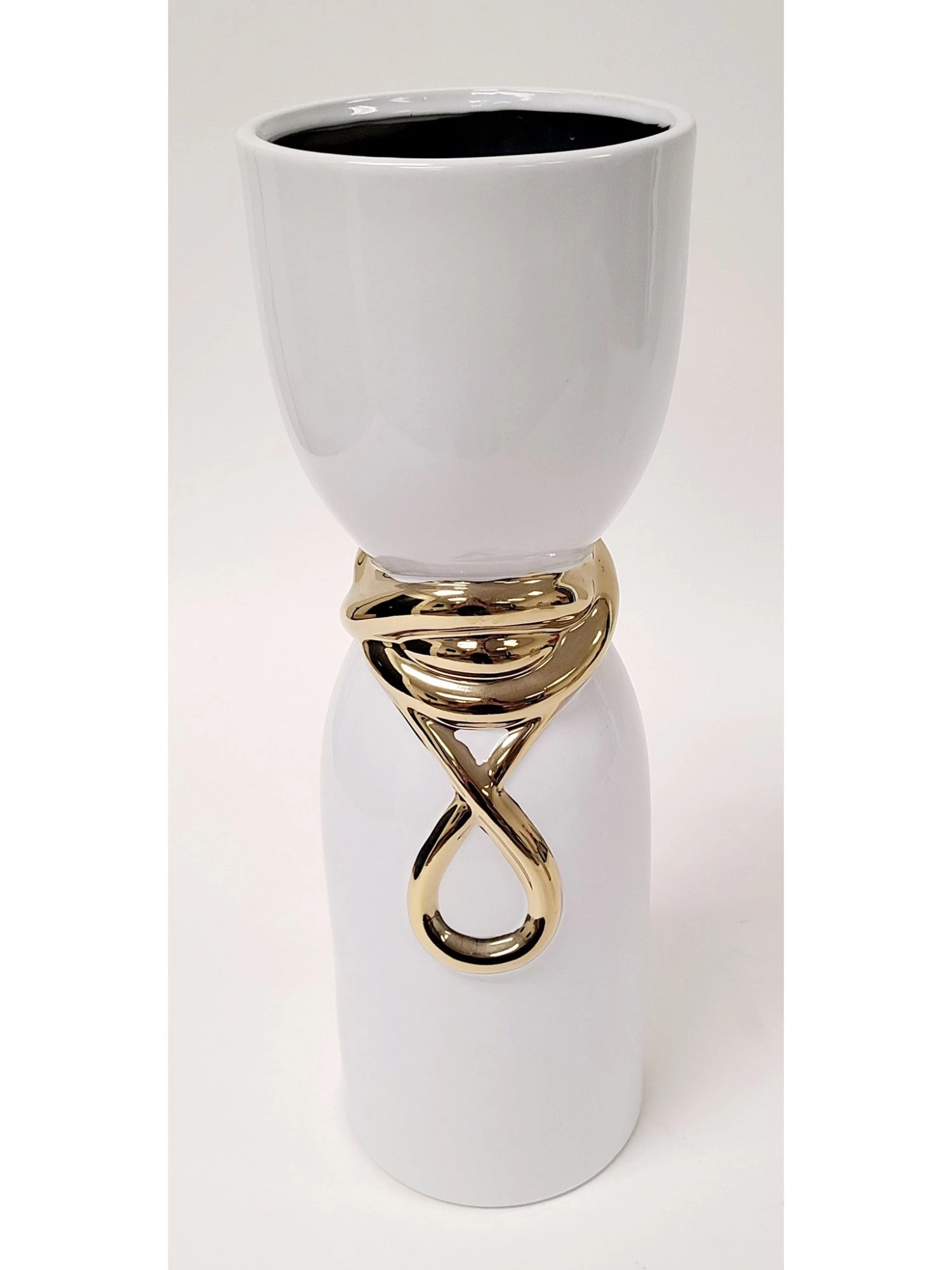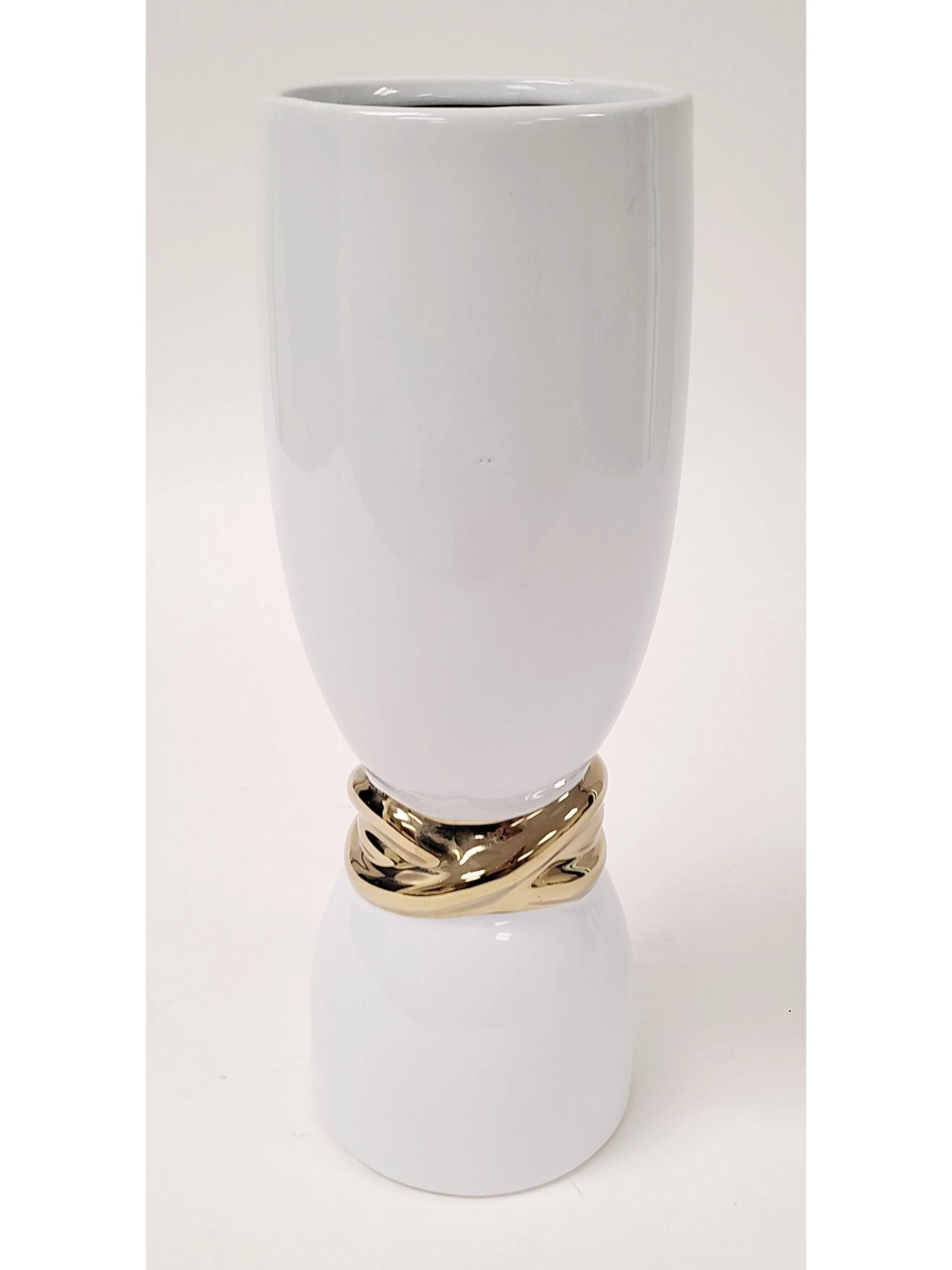Description: This white and gold vase has a beautiful and unique style! You can style it on its own or on top of a tray with your favorite faux floral. The tall vase has a beautiful cascading gold design and the short has an elegant detailed golden braid design. These match well with the white bowl with elegant gold design.