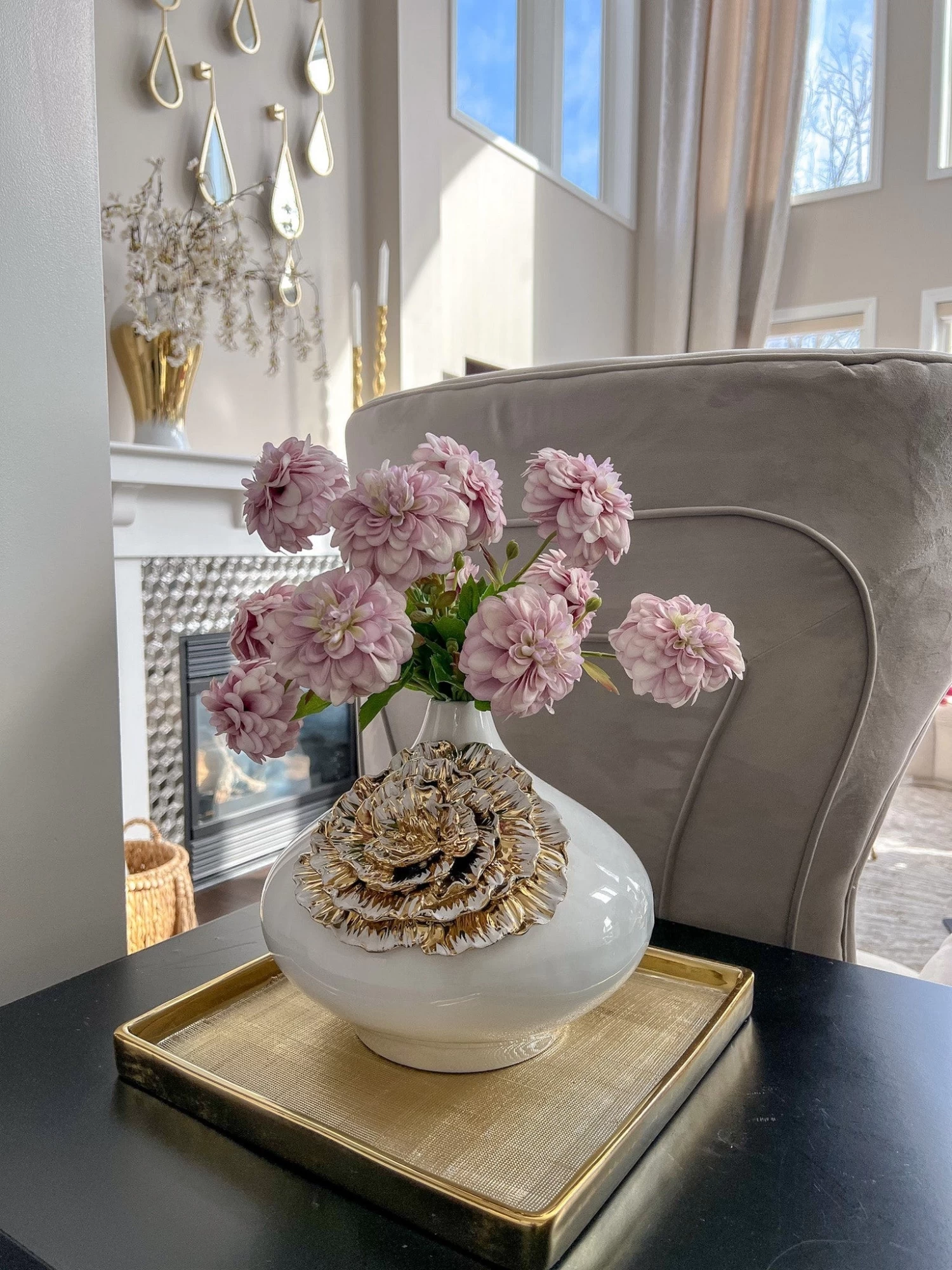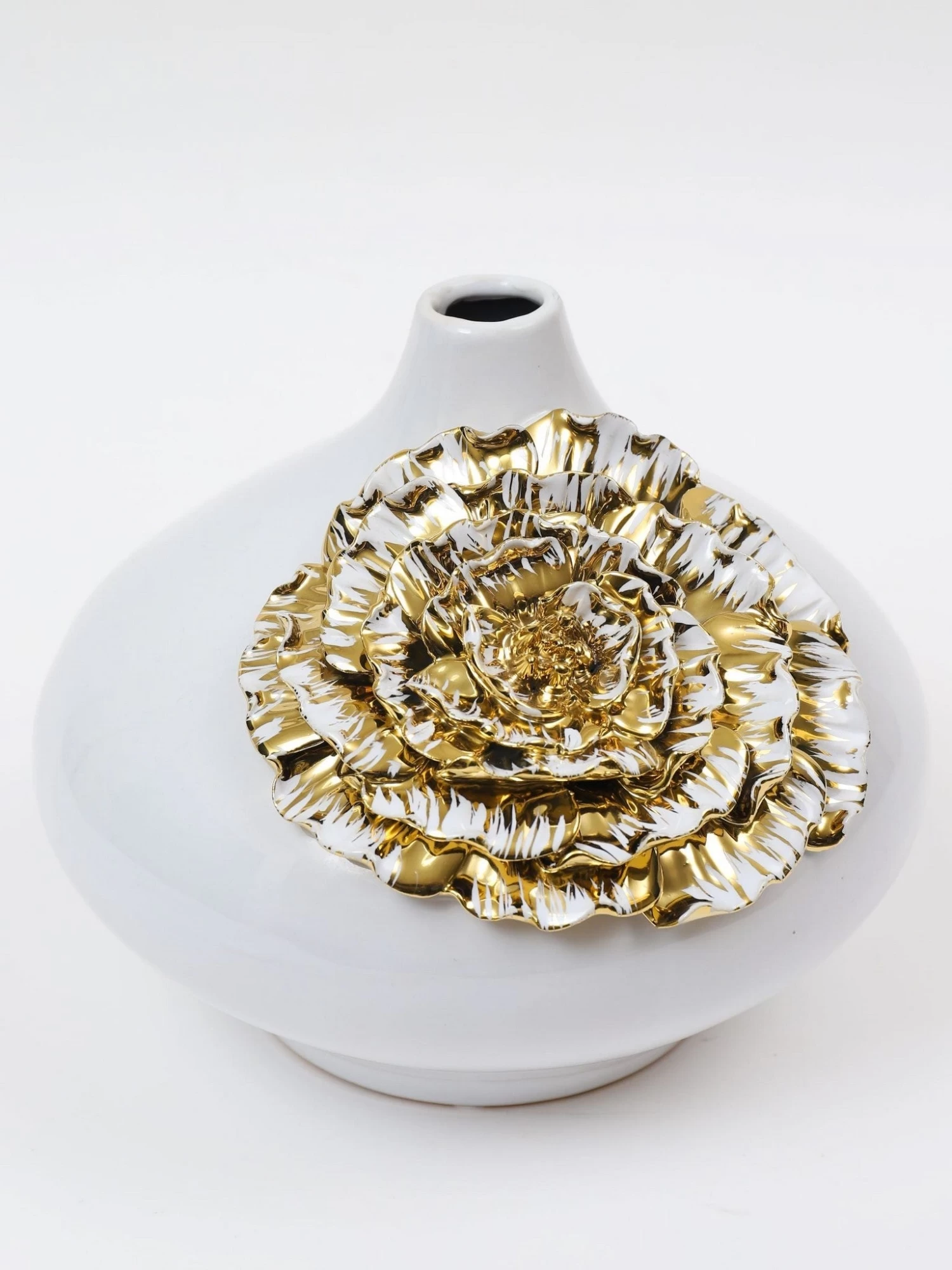 Description: This gorgeous white porcelain vase with a stunning gold flower design will make a stunning addition to your home decor!