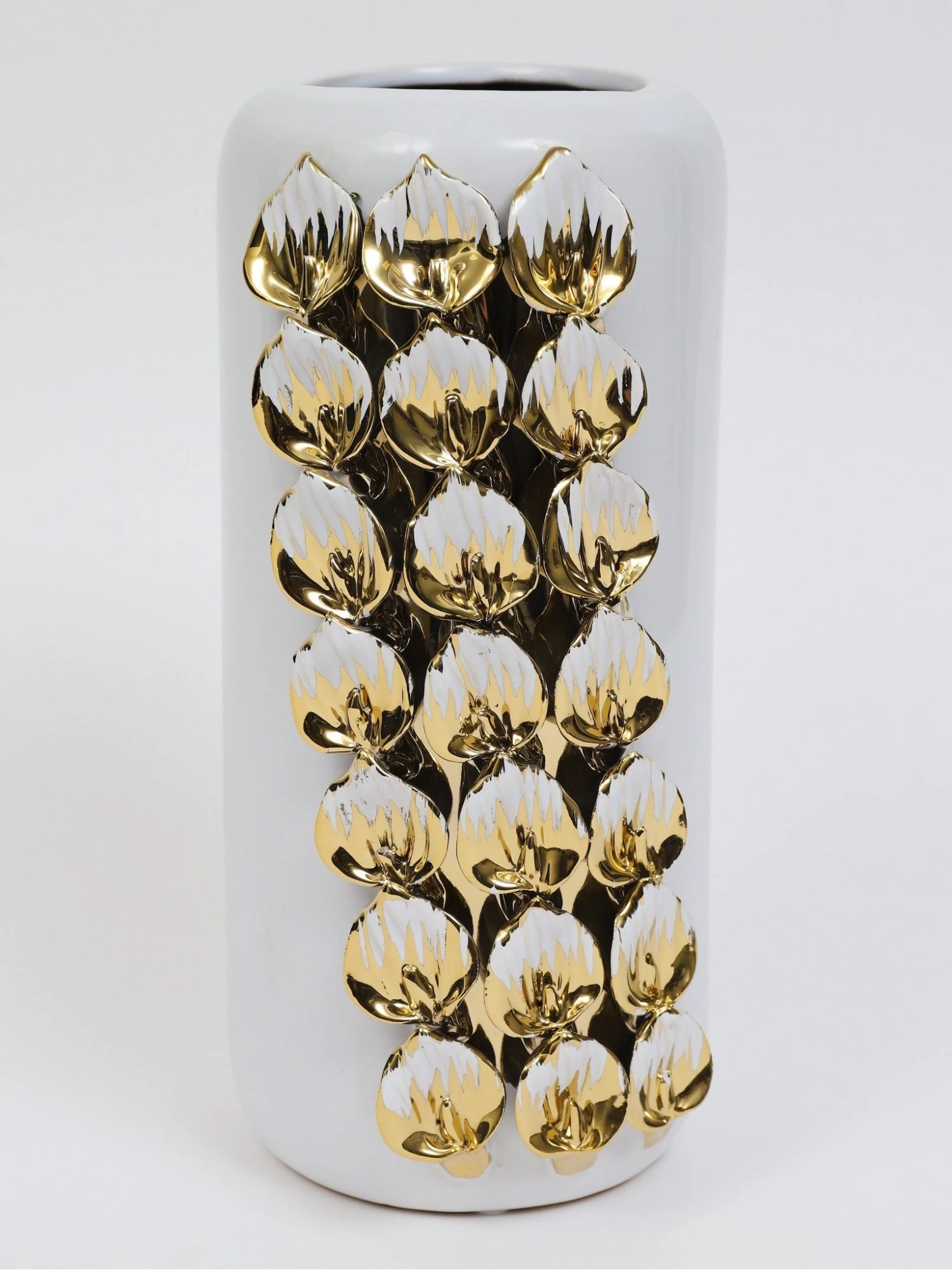 Description: This white and gold vase is substantial and will make a statement anywhere you style it. The vase has a beautiful gold and white petal design on the exterior, creating an abstract look. This design is modern and elegant in every possible way.