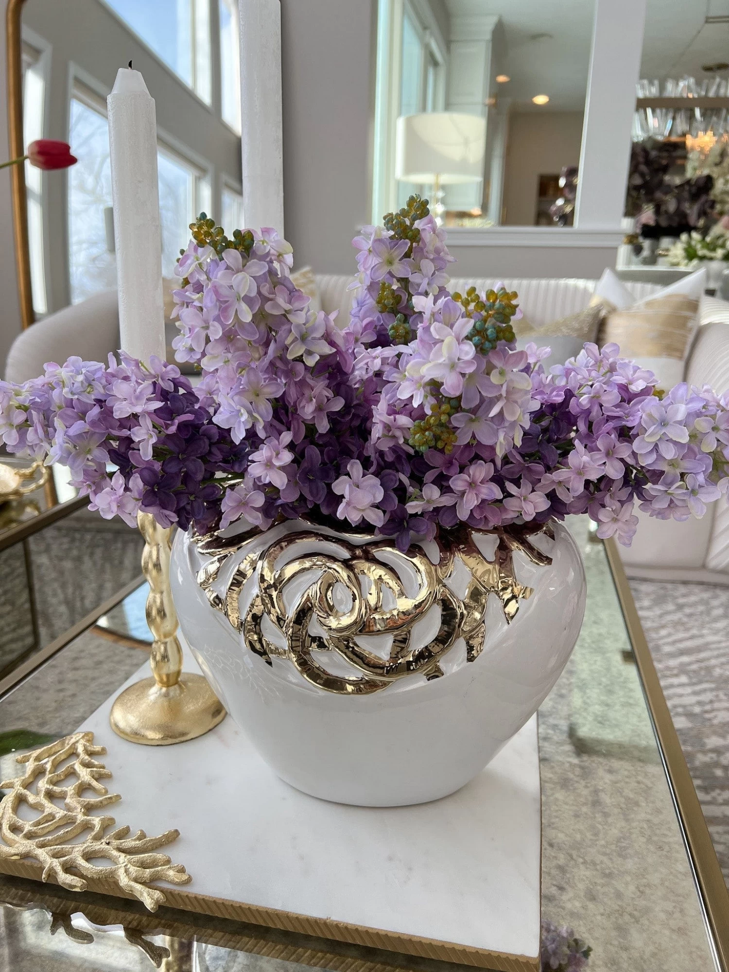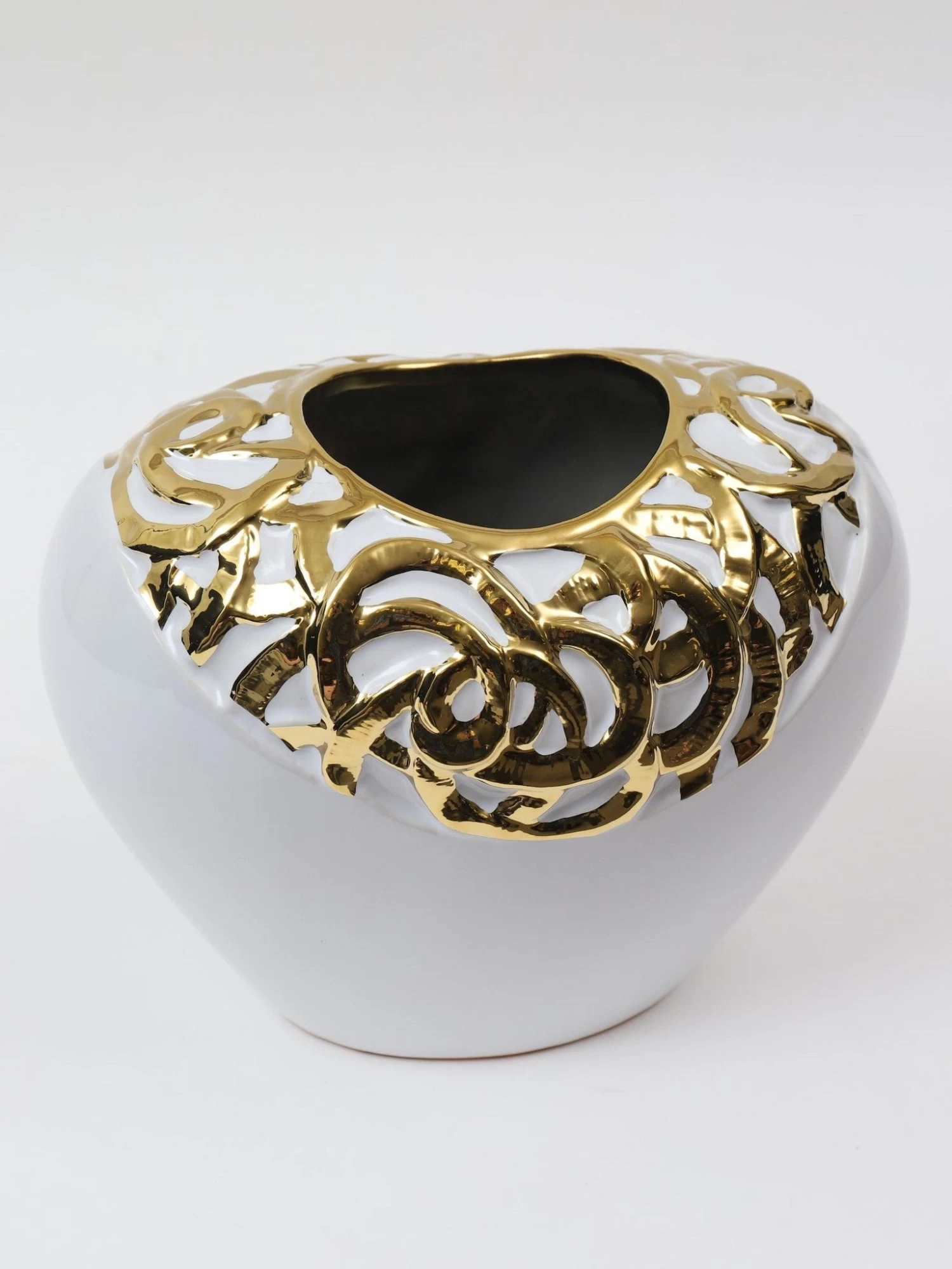 Description: This is a beautifully shaped vase with stunning gold detail around the top.