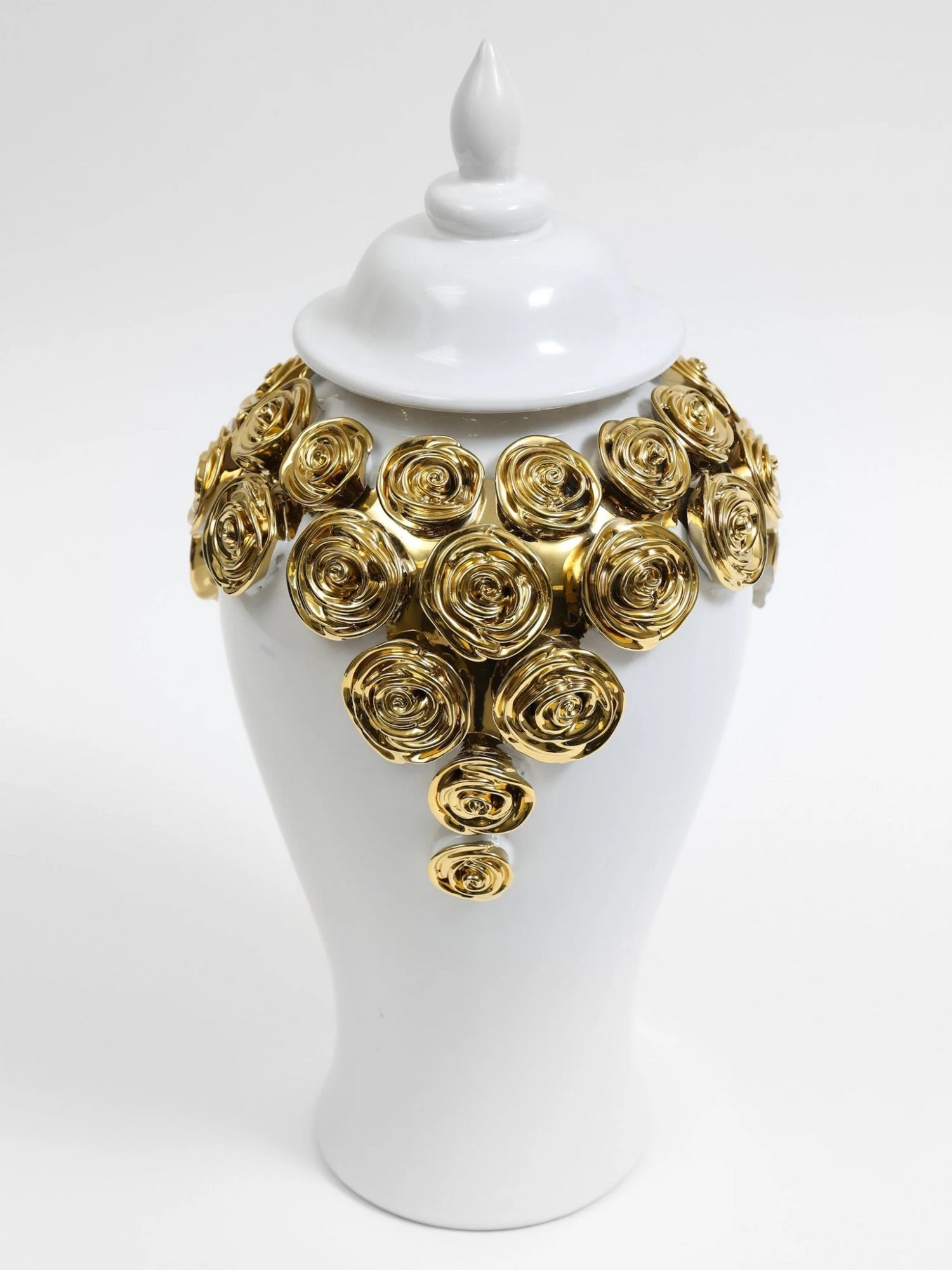 Description: This white ginger jar features an elegant gold cascading floral detailing. Perfect for any room, the timeless design will add a classic touch to any décor. It’s an ideal base to showcase your favorite faux florals. An essential addition to create a stylish tablescape.