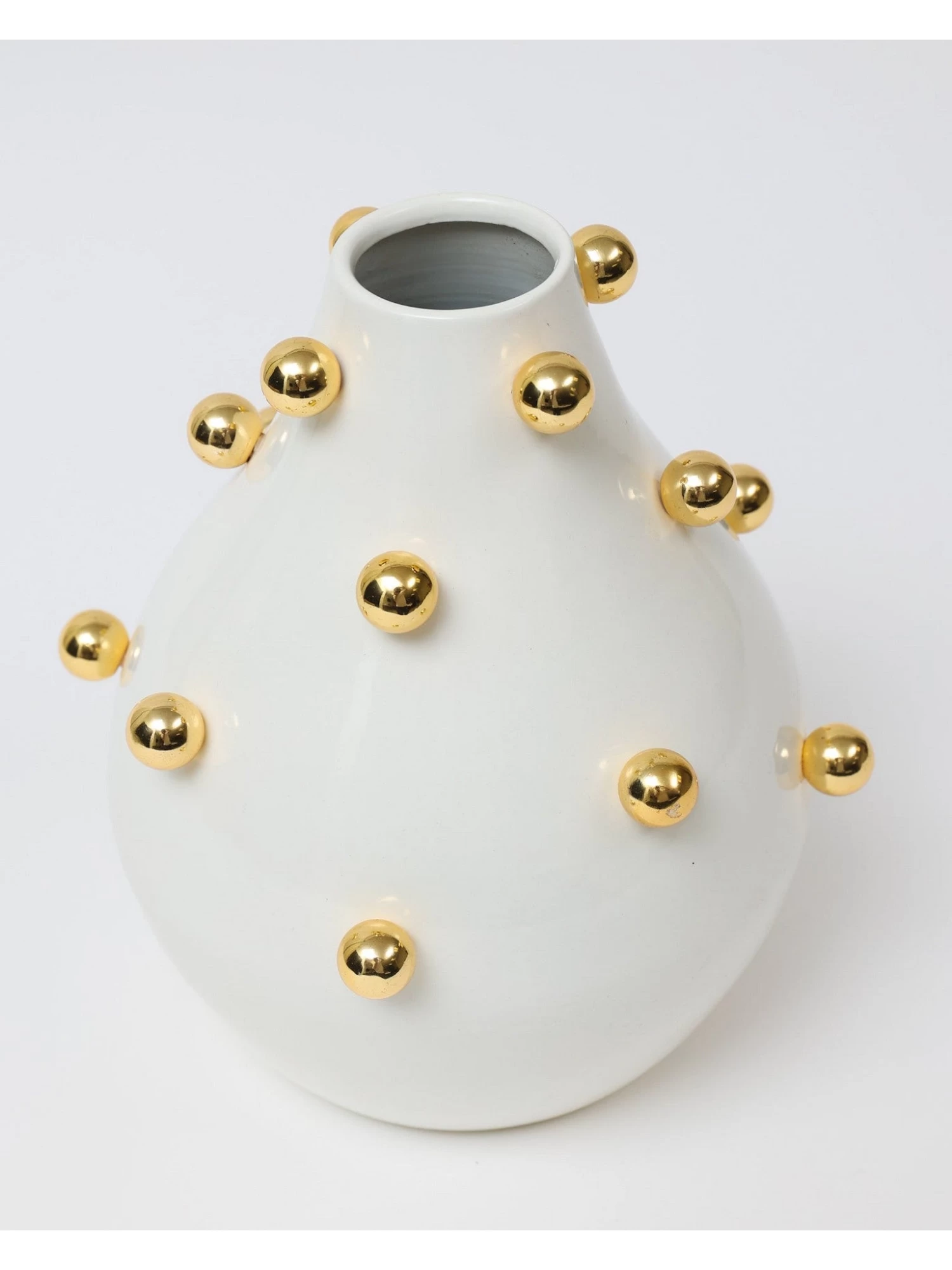 Description: This unique white vase with gold studs is sure to attract attention. Fill with your favorite faux florals and make a statement in any room!