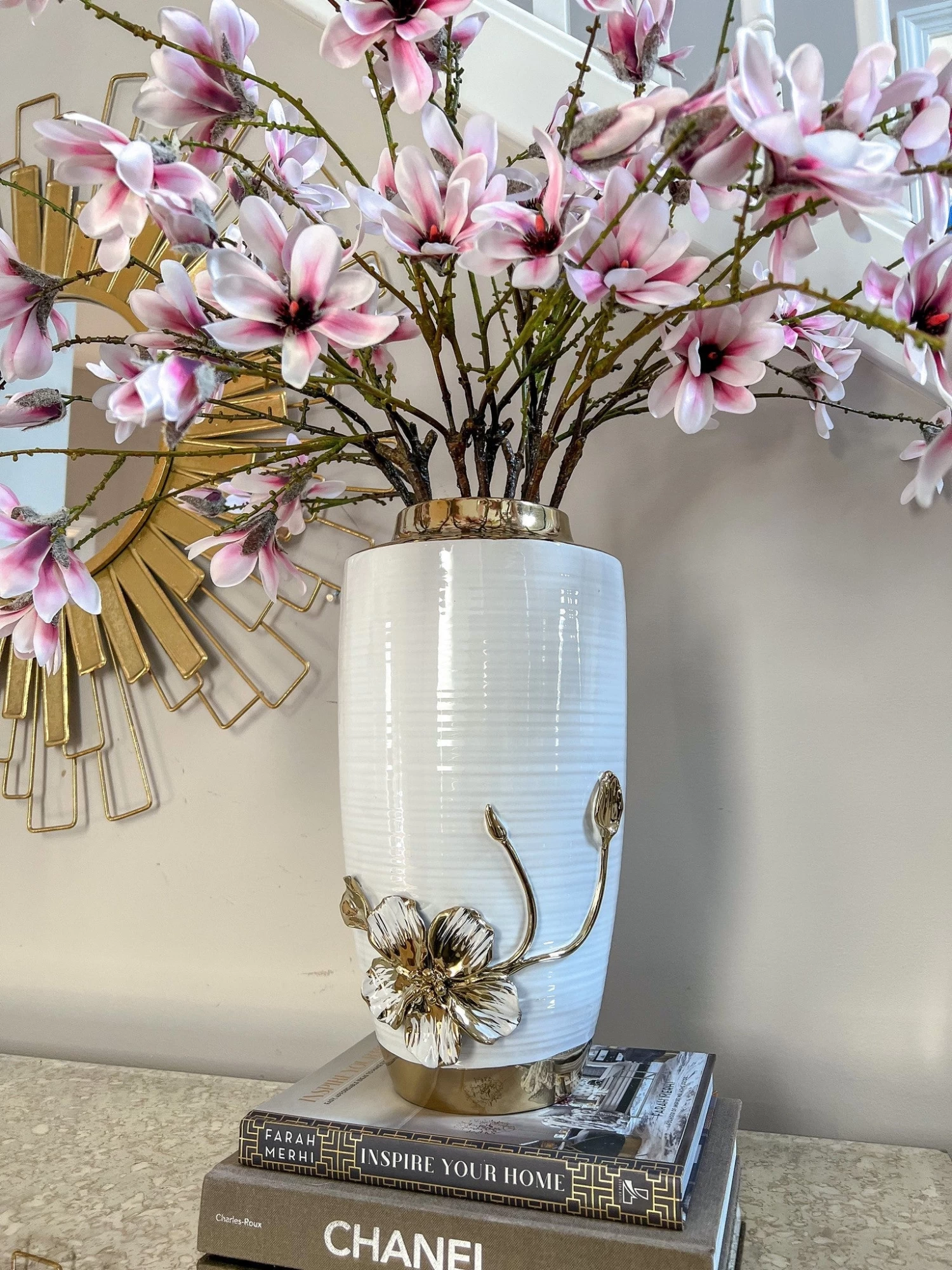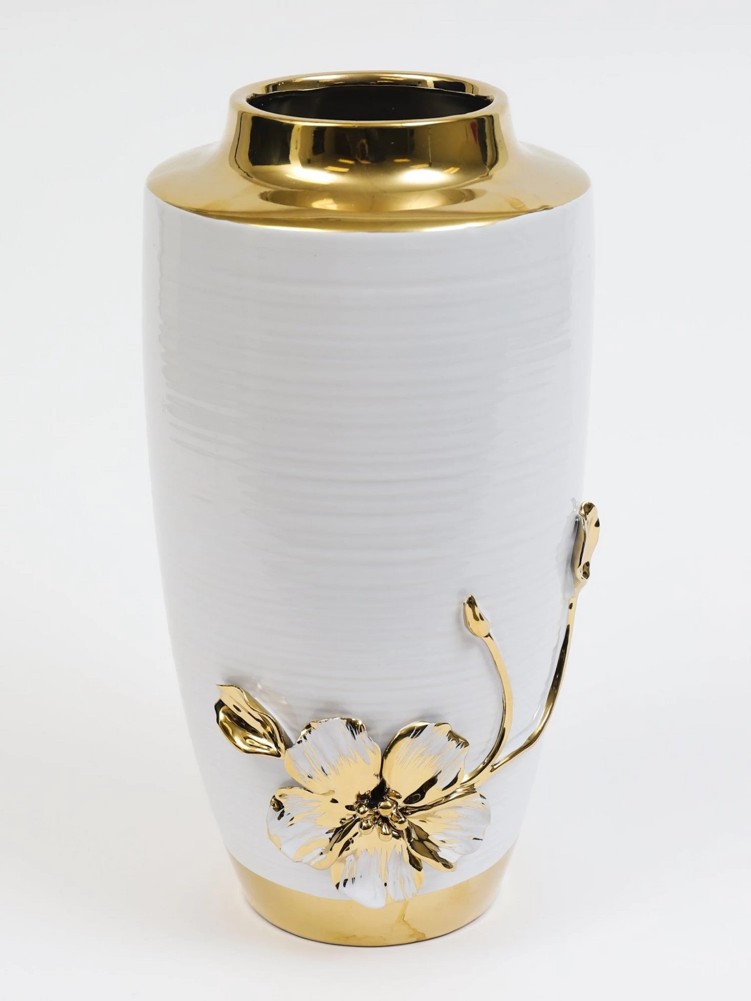 Description: This stunning white and gold vase features a white with gold detail intricate flower design that is just stunning. We love the delicate details in the flower.