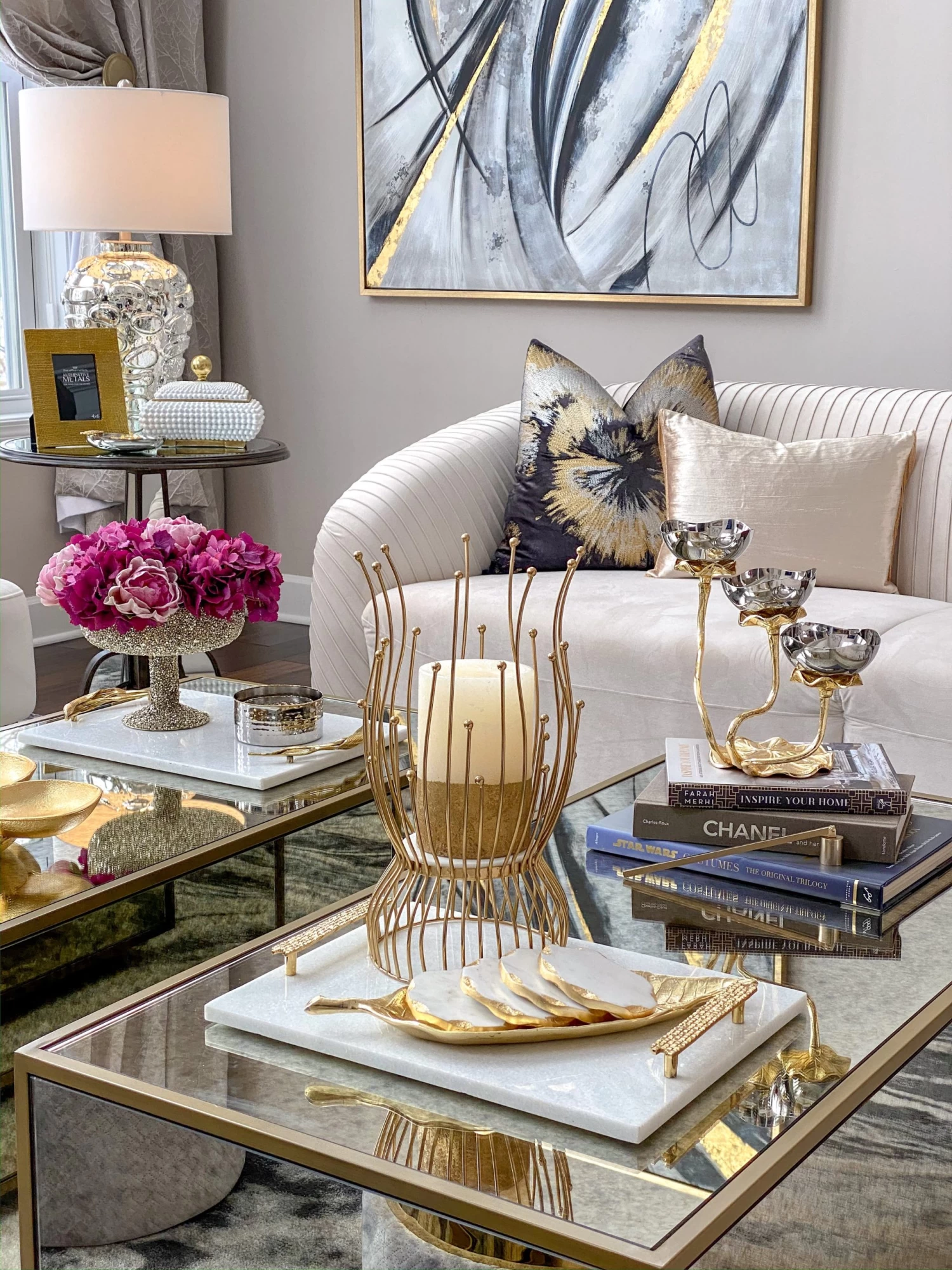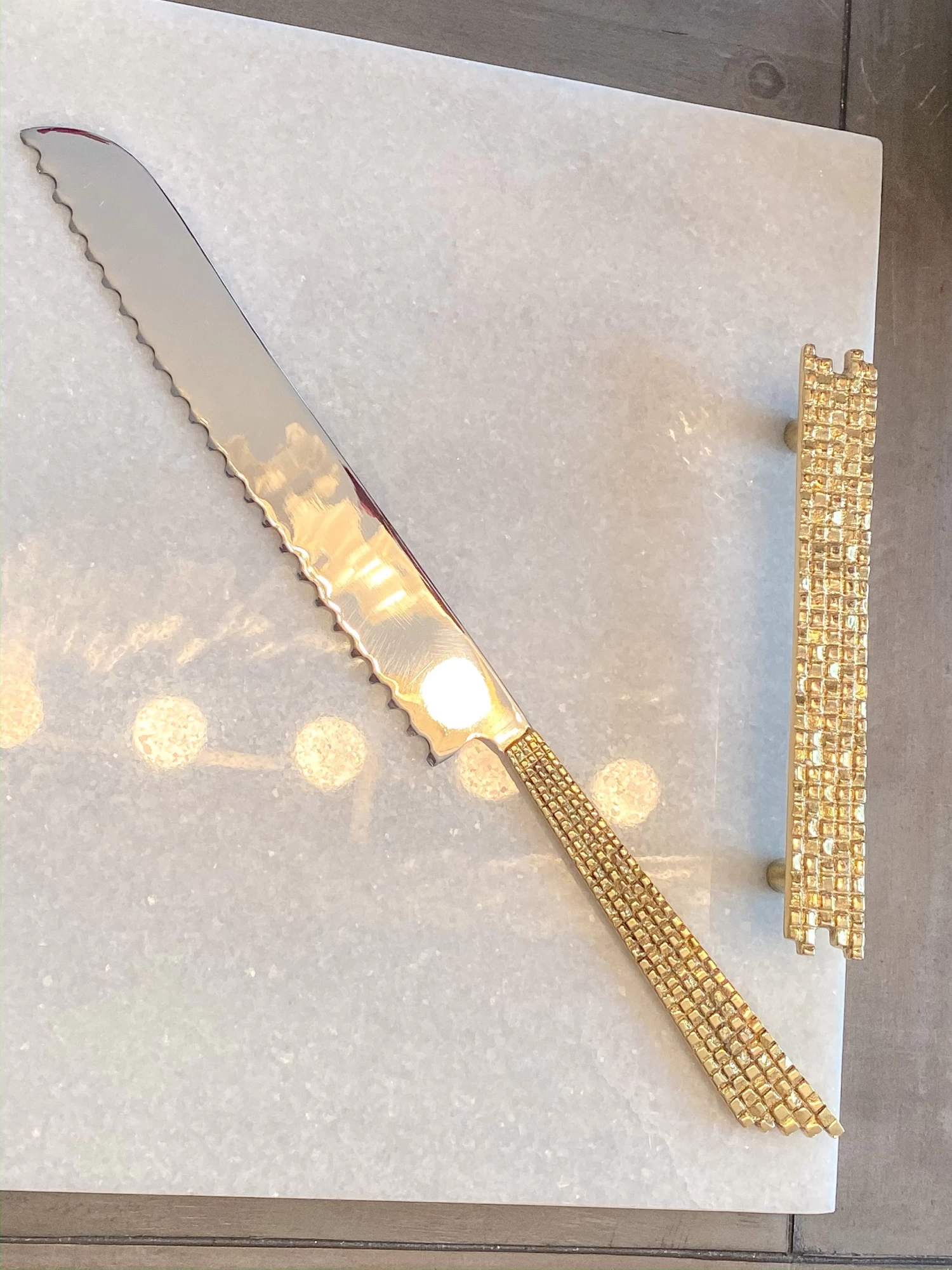 A Large white marble tray with gold mosaic handles. A very substantial statement piece, perfect for displaying hors d’oeuvres or other beautiful decor pieces.