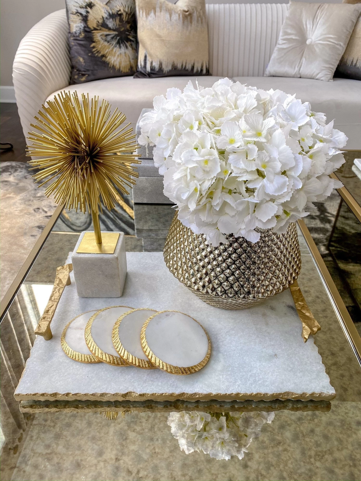 A white marble tray with gold crumbled handles. A statement piece, perfect for displaying hors dโoeuvres or other beautiful decor pieces.