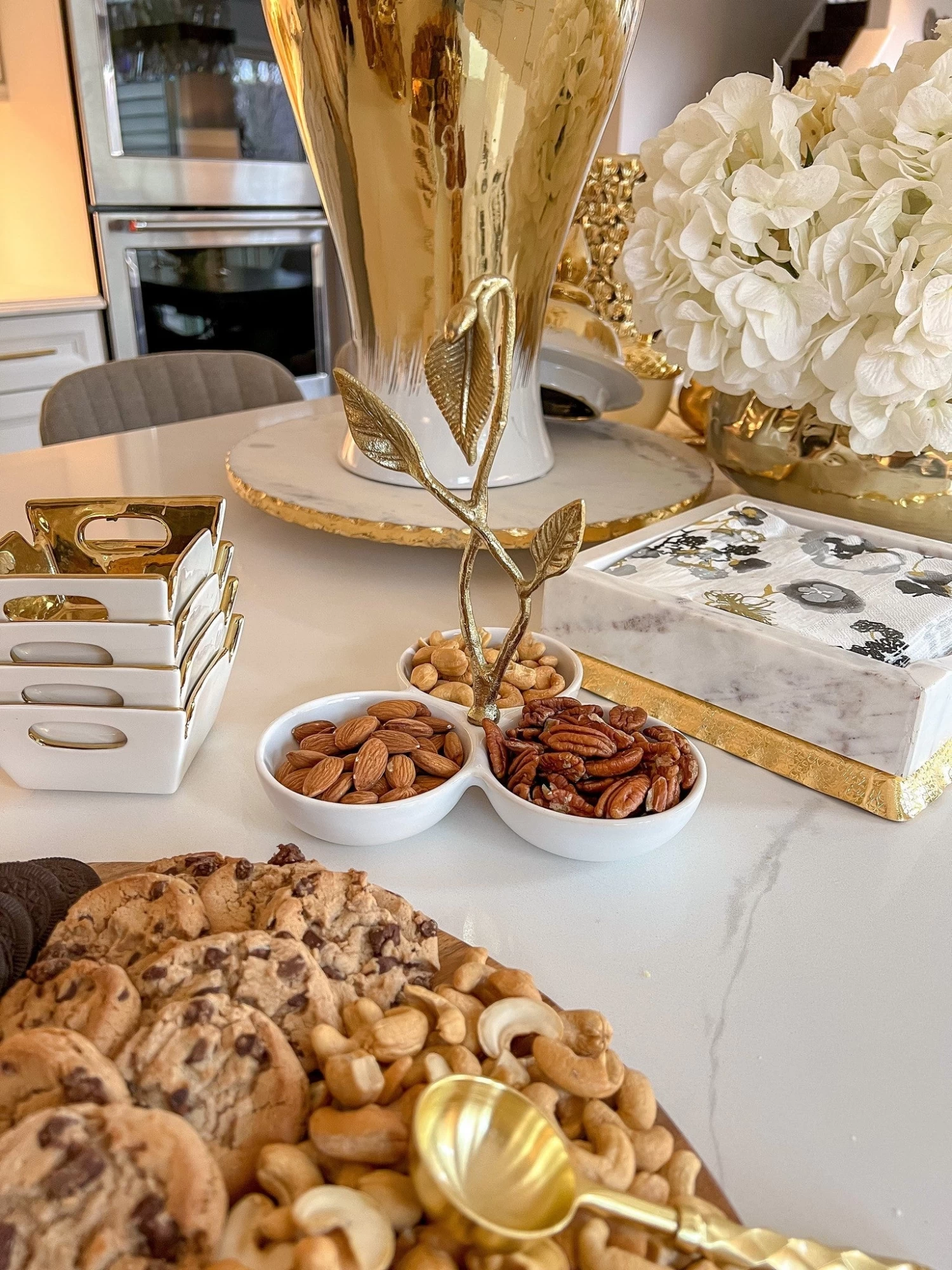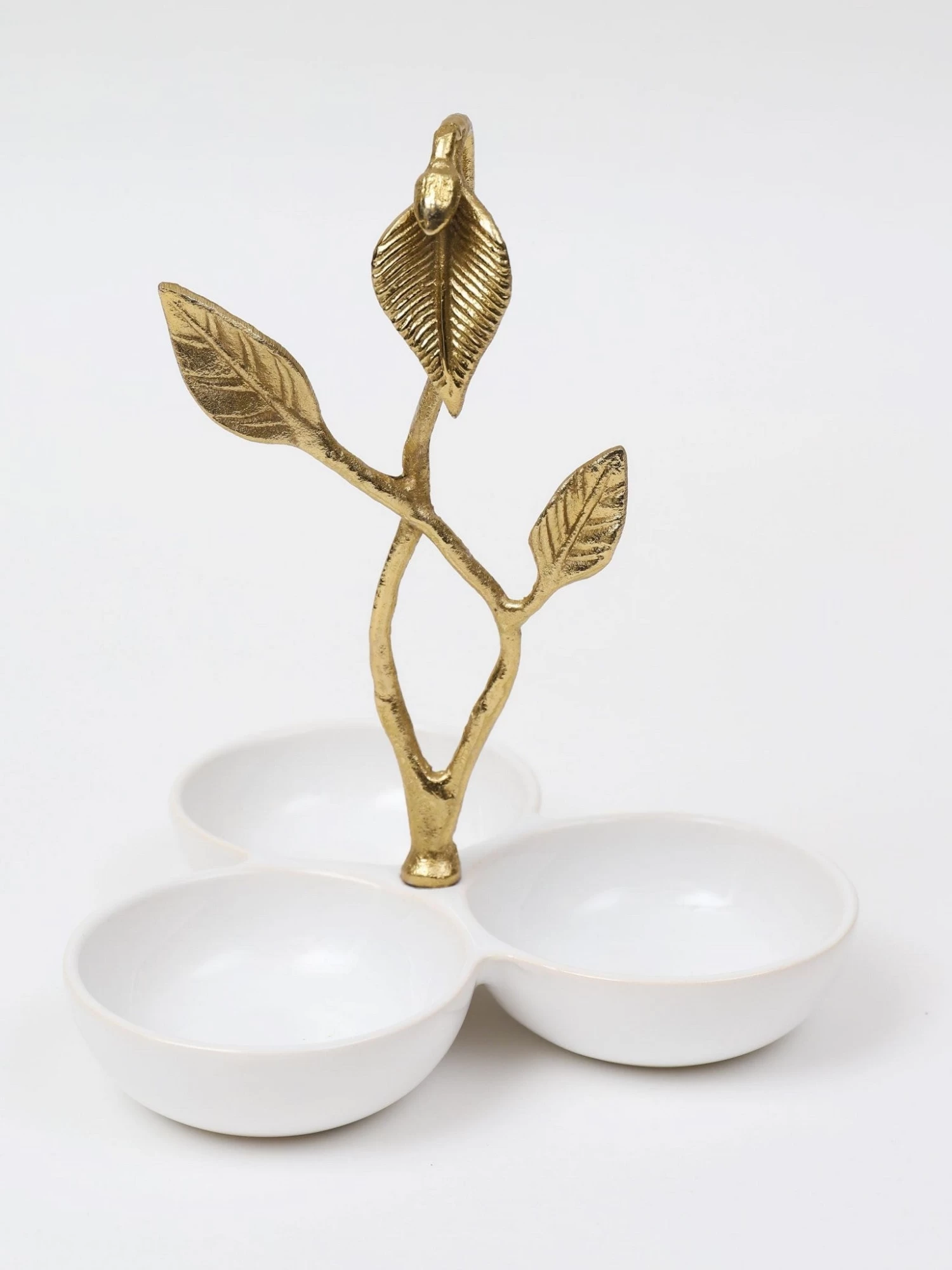 Description: This 3 bowl snack dish is such an elegant display for your snacks or condiments. The gold metal leaf details make this a timeless piece that can be used for years to come.