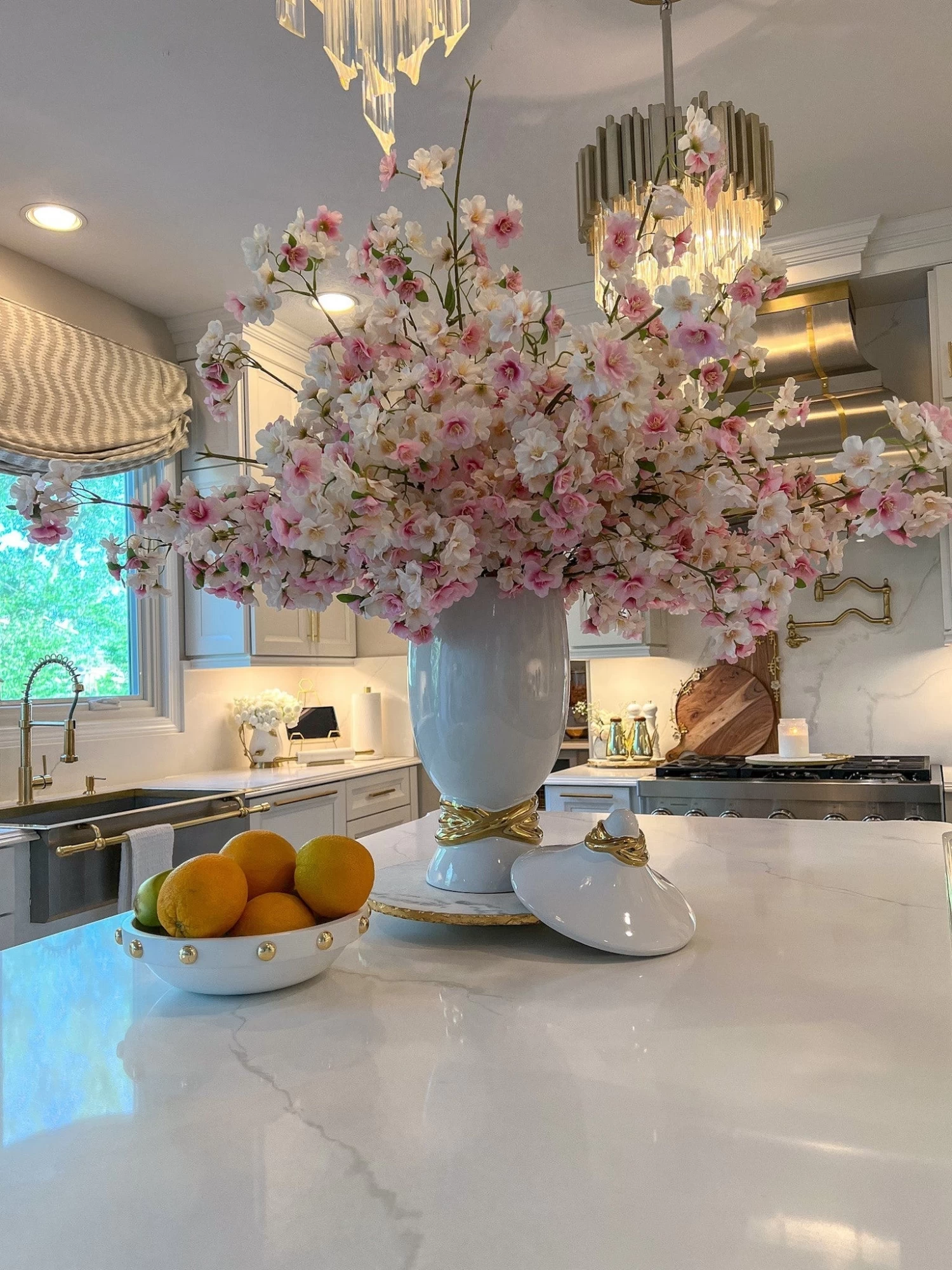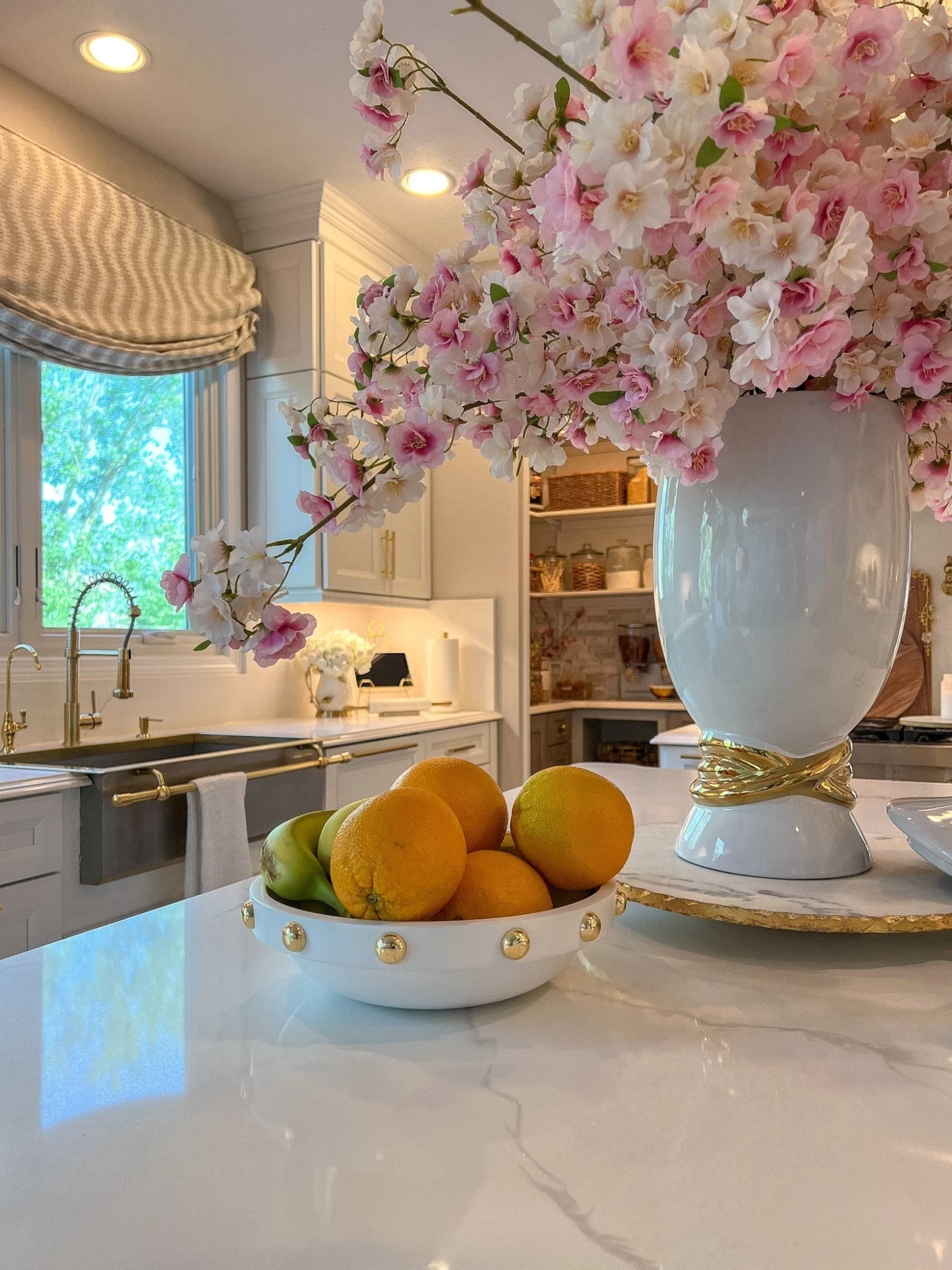Description: This is one gorgeous white bowl with stunning gold beaded details along the top rim. You can use this for a fruit bowl or place your favorite floral orbs or stems in.