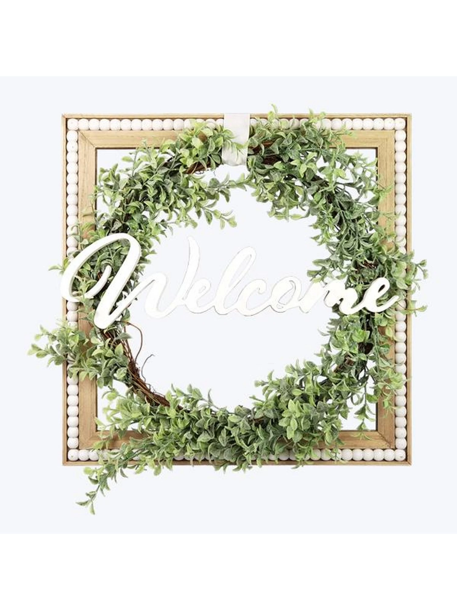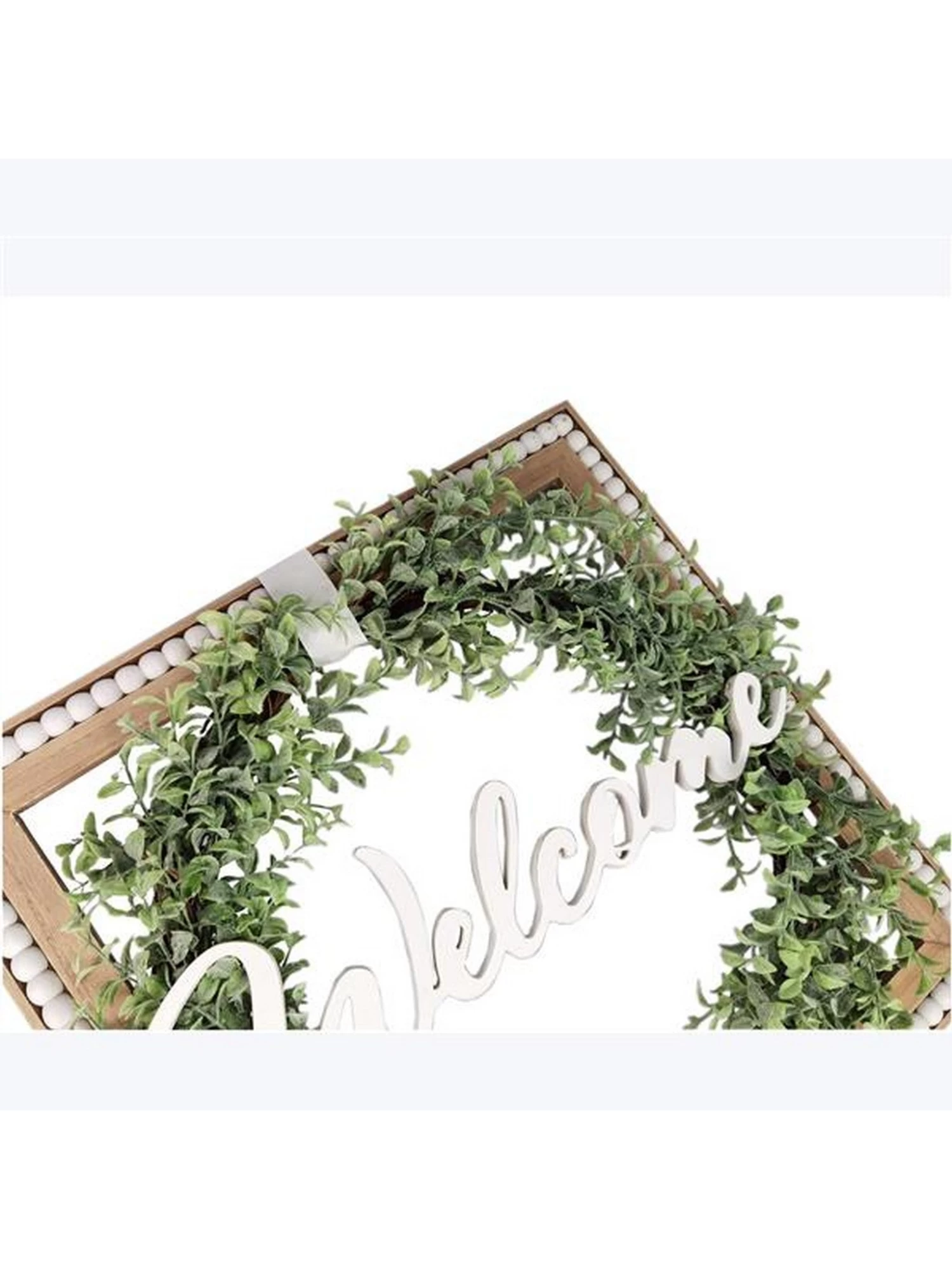 Description: Spruce up your living space with this wood-framed wreath detailing with a bead accent featuring a welcoming sign that attracts your guests.