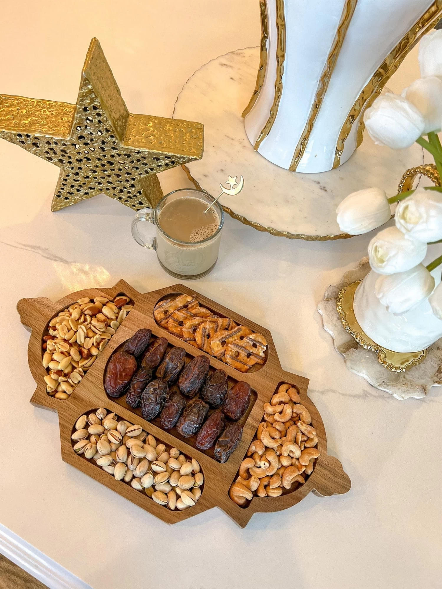 Description: What a fun way to serve your guests! Our Wooden Lantern Tray is perfect for elevating your table decor and making a statement. Fill it in with fruits, nuts, chocolates, Ramadan dates, and/or Eid desserts. You can’t go wrong with creating a charcuterie board in a festive lantern shape. This piece was inspired by Islamic art and modern elements. The all-natural, food-safe Acacia wood is high quality, durable, and elevates any space year-round. Make it your own and fill it with as many colors and snacks as you like because who doesn’t love a cute festive platter!?